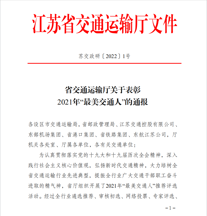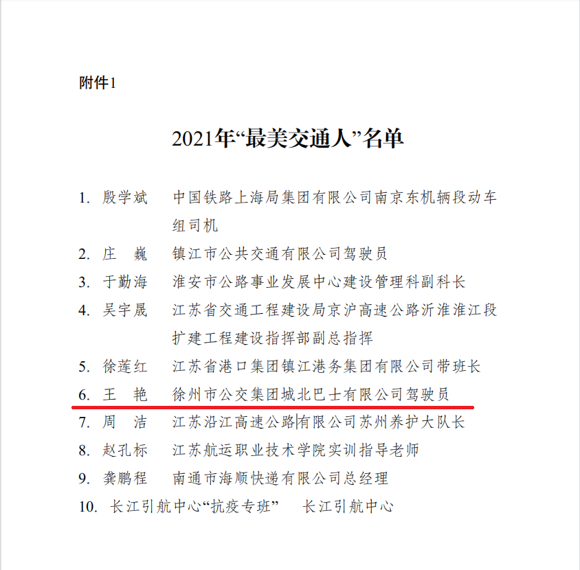 近日,江蘇省交通運輸廳下發(fā)《省交通運輸廳關(guān)于表彰2021年“最美交通人”的通報》,徐州公交集團公交車駕駛員王艷榮獲“最美交通人”稱號。
