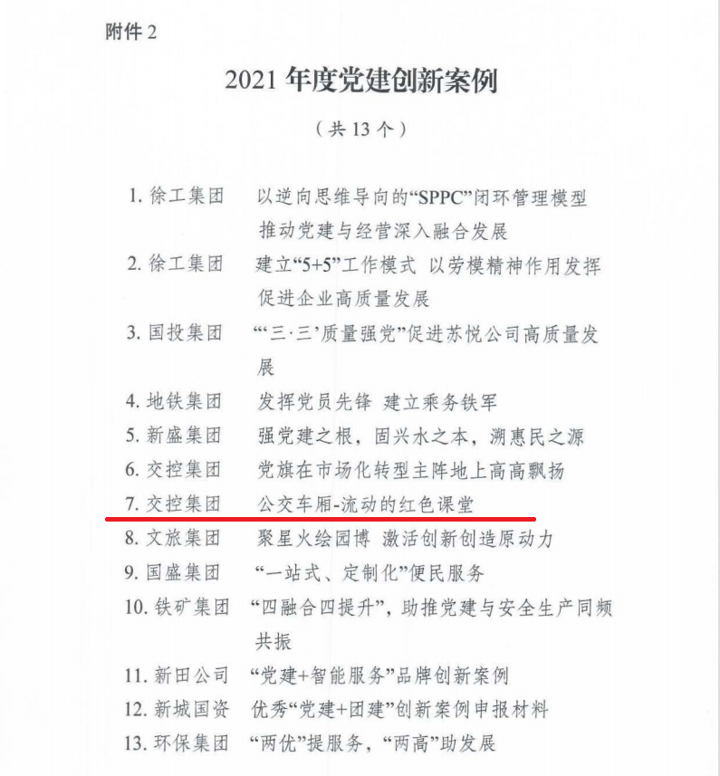 同時,市國資委黨委通報了2021 年度十佳黨建品牌和優(yōu)秀"黨建+"創(chuàng)新案例評選表彰結(jié)果,徐州公交《公交車廂-流動的紅色課堂》獲評2021年度黨建創(chuàng)新案例。