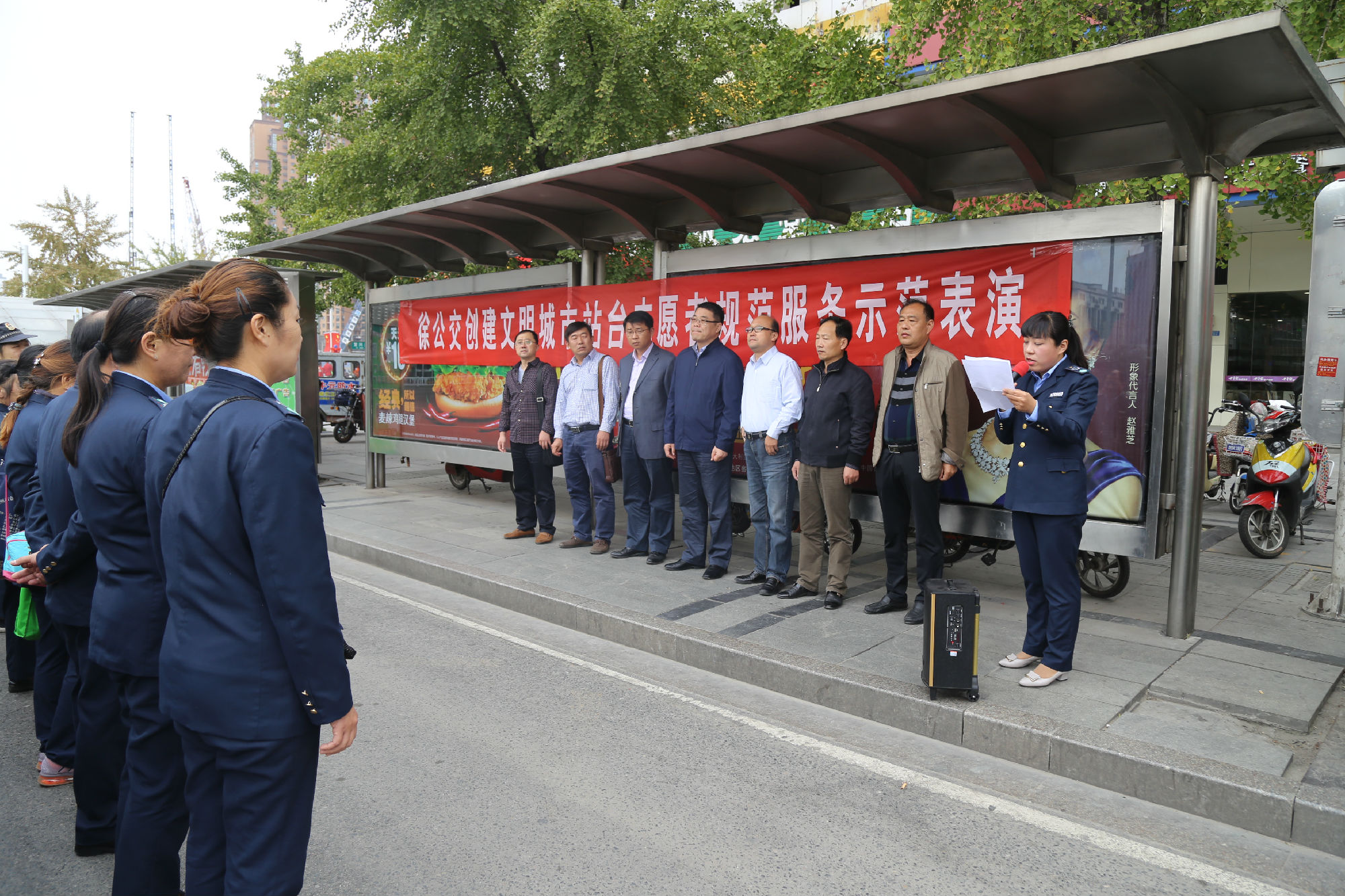 為進(jìn)一步規(guī)范站臺(tái)服務(wù)引導(dǎo)工作,不斷推動(dòng)文明城市創(chuàng)建順利進(jìn)行,10月9日上午,公司在徐州站主廣場(chǎng)舉行了一次公交站臺(tái)秩序規(guī)范服務(wù)示范表演。團(tuán)市委副書記夏友峰、運(yùn)管處客運(yùn)科科長陳福升、以及市創(chuàng)建辦交通秩序二組三位領(lǐng)導(dǎo)蒞臨觀摩。服務(wù)督導(dǎo)隊(duì)34名站臺(tái)志愿者參加了示范表演。