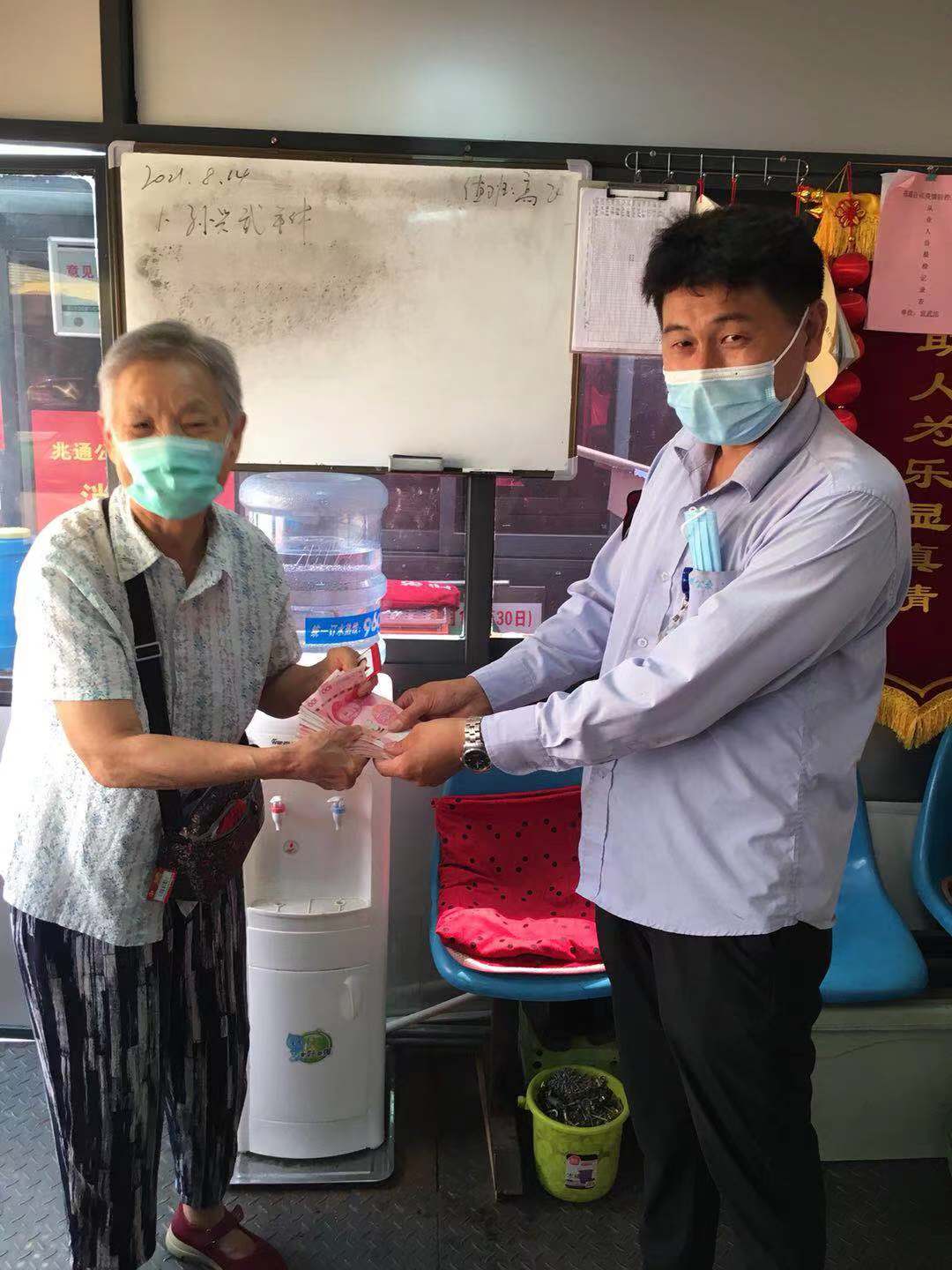 8月14日上午,段世望像往常一樣駕駛61路8294號車從徐村開往宣武市場,在宣武市場車站打掃衛(wèi)生時,在座位下發(fā)現(xiàn)一個錢包,段師傅立即將包交到車站值班室,包內裝有身份證及四千余元現(xiàn)金。此時,段師傅正準備返回車廂做出車前準備,迎面碰到了心急如焚尋找失物的老人。