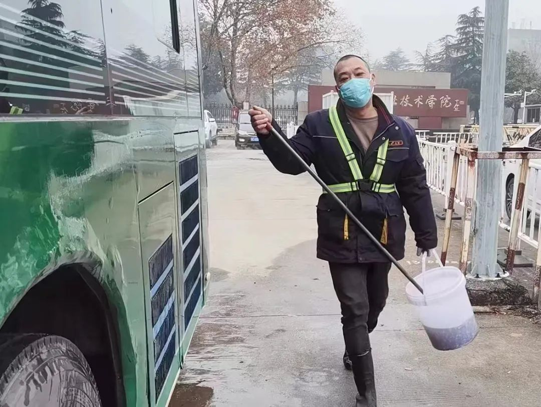 春運(yùn)期間,為保障廣大市民乘客出行需求,部分公交線路縮短了發(fā)車時間,增加了運(yùn)營車輛,再加上客流增多,路面擁堵等情況,公交車回到終點(diǎn)站停放的時間很短,又要投入到下一趟的運(yùn)營當(dāng)中,這無疑給車輛保潔工作帶來了一定的困難。因此,為確保出場車輛干凈整潔,每天天沒亮,張璞已經(jīng)在建筑學(xué)院停車場里忙起來了。只見他一手拿毛刷,一手拎水桶,開始清潔車廂外部,張璞動作嫻熟地擦拭前擋風(fēng)玻璃、車廂外部兩側(cè),不一會,他的臉上就已掛滿了汗珠,平均一輛車10分鐘的清潔時間,是他十多年工作鍛煉出來的速度。近日氣溫驟降,持續(xù)有冰凍天氣,如果抹布太濕,早晨擦座椅時會粘在上面,為此張璞都會提前準(zhǔn)備好潮濕的抹布,既能擦掉扶手、座椅、靠背上的浮塵,還不會留下水漬。像這樣日復(fù)一日的簡單工作,張璞堅(jiān)持了十多年,他平均每天要打掃23臺車,平均一輛車10分鐘的清潔時間,張璞用自己的勞動,換來了車輛的干凈整潔。