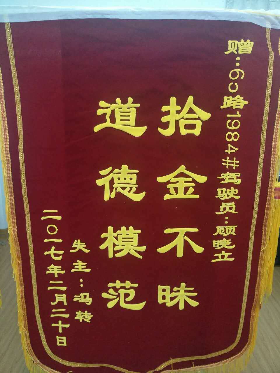 2月20日上午,乘客馮先生從第四人民醫(yī)院乘65路車到礦務(wù)局下車去兒童醫(yī)院給孩子看病,匆忙下車時(shí)把手提包丟在車上,當(dāng)時(shí)非常著急,內(nèi)有身份證兩張,銀行卡數(shù)張,由于丟失身份證不能給孩子辦理出院手續(xù),焦急萬分。65路1984號(hào)車駕駛員顧曉立拾到后,妥善保管,交還馮先生。馮先生十分感謝,特送來錦旗一面,并撥打12345表?yè)P(yáng)。