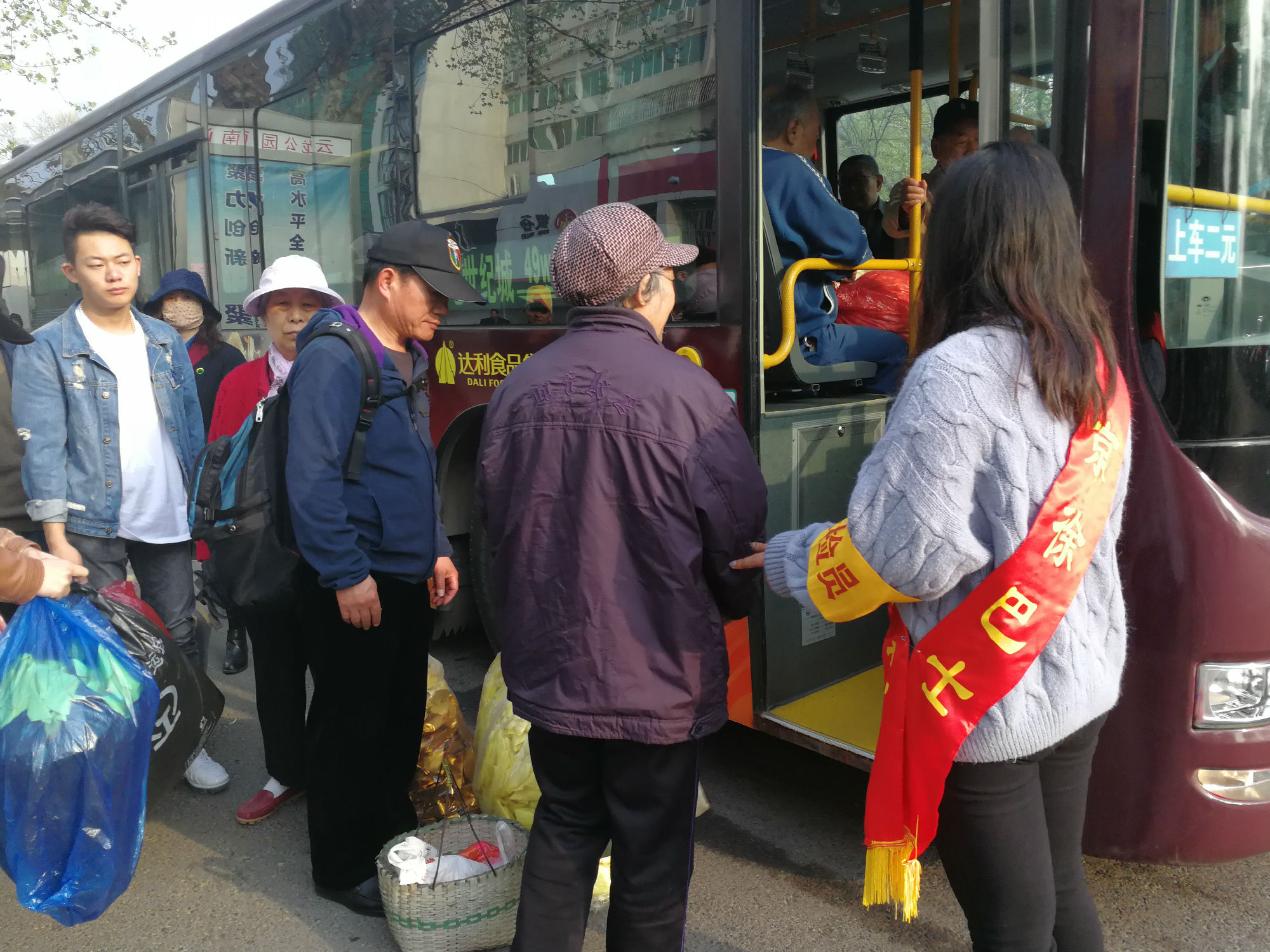 云龍公園南門,站滿了拿著大包小包的乘客?!按蠹遗藕藐?,注意安全,不要擁擠,需要換零錢的乘客可以到零幣兌換處換取零錢?!敝驹刚呶⑿χS持現(xiàn)場秩序。人群中有位提著兩個大包裹的大媽,志愿者走到大媽跟前,關(guān)切地詢問:“大媽,我來幫您把包裹拿上車吧?!敝驹刚咭皇謹v扶老人上車,一手拿著物品,為其安排好座位并叮囑大媽注意安全。一班車走后,還沒撈著喝口水,現(xiàn)場又聚滿了乘客,志愿者們又開始忙碌起來:“大爺,車還要一會才能來,您先坐這歇一會吧?!敝驹刚吣脕戆宓剩尷洗鬆斪滦菹?,老大爺十感動,說道:“你們真貼心。